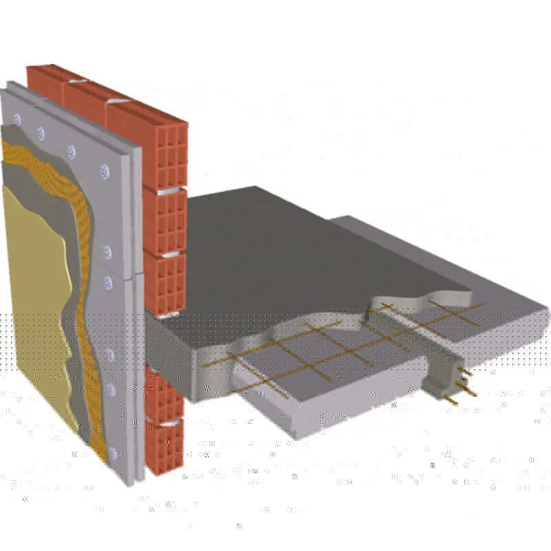 Camada de EPS colada, ou de preferência pregada com buchas e revestida por rebocos sintéticos armados com rede em fibra de vidro.